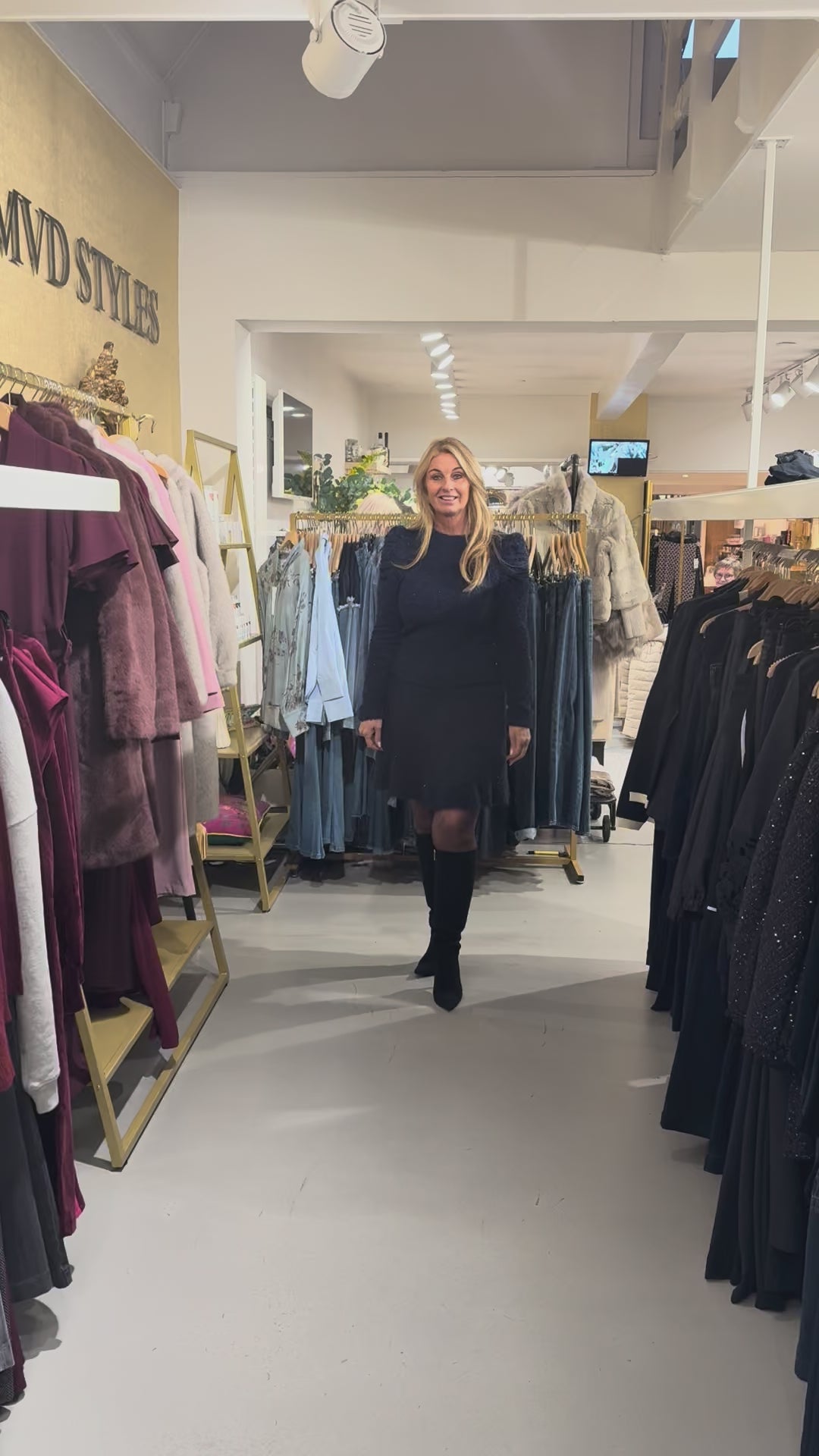 De Eve Pullover in navy is gemaakt van een speciaal ontwikkelde, luchtige stof van 100% polyester. De trui heeft lange mouwen met een subtiel pofdetail op de schouder en een fijne harige glitter in de stof, waardoor je moeiteloos straalt – perfect voor zowel een casual als feestelijke look. Combineer met de bijpassende Katy Skirt voor een complete outfit.