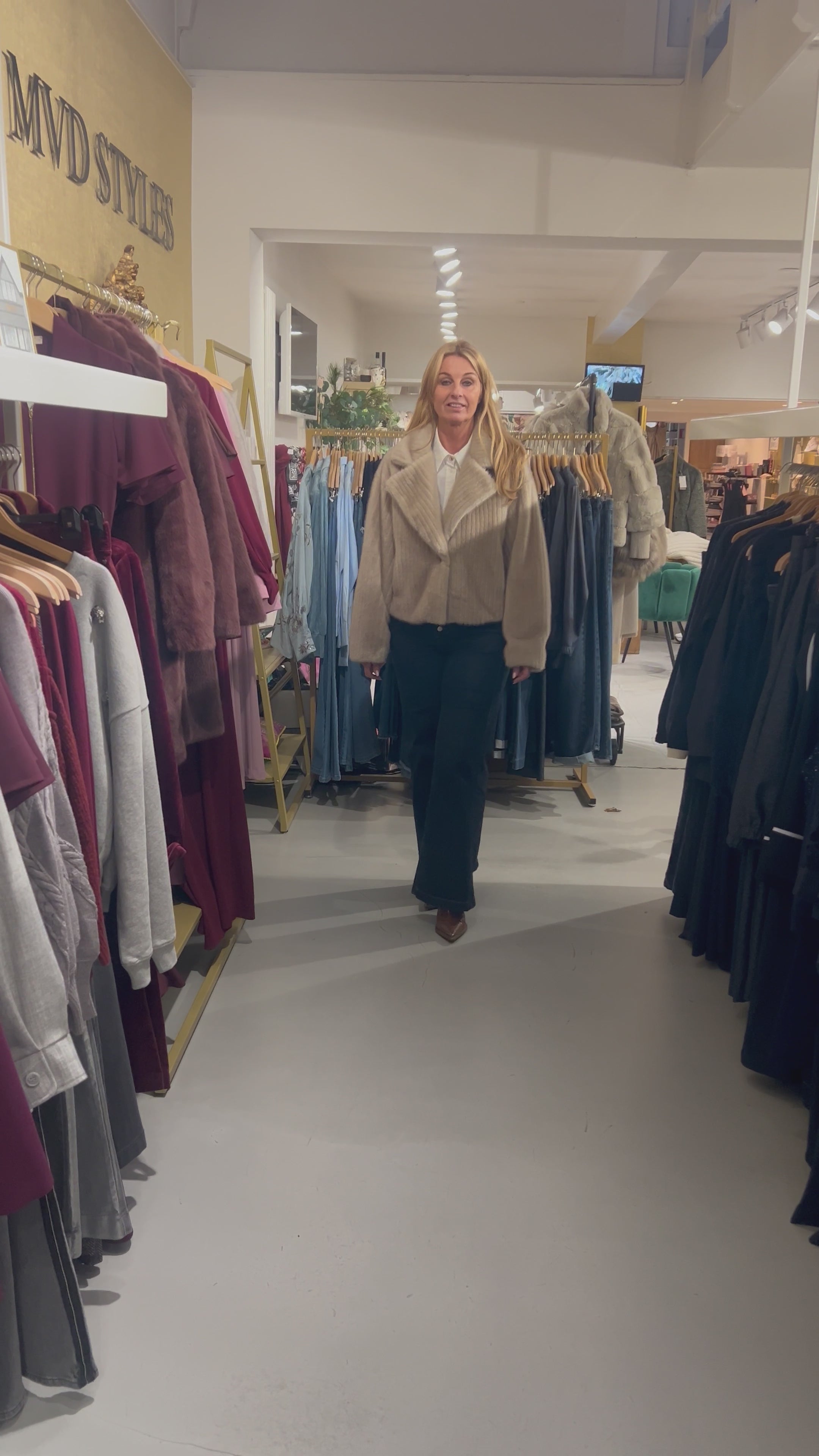 Deze korte jas van gerecycled imitatiebont met subtiel streepeffect is zowel stijlvol als duurzaam. Volledig gevoerd en voorzien van steekzakken aan de voorkant en een binnenzak, ideaal voor een comfortabele en trendy winterlook.