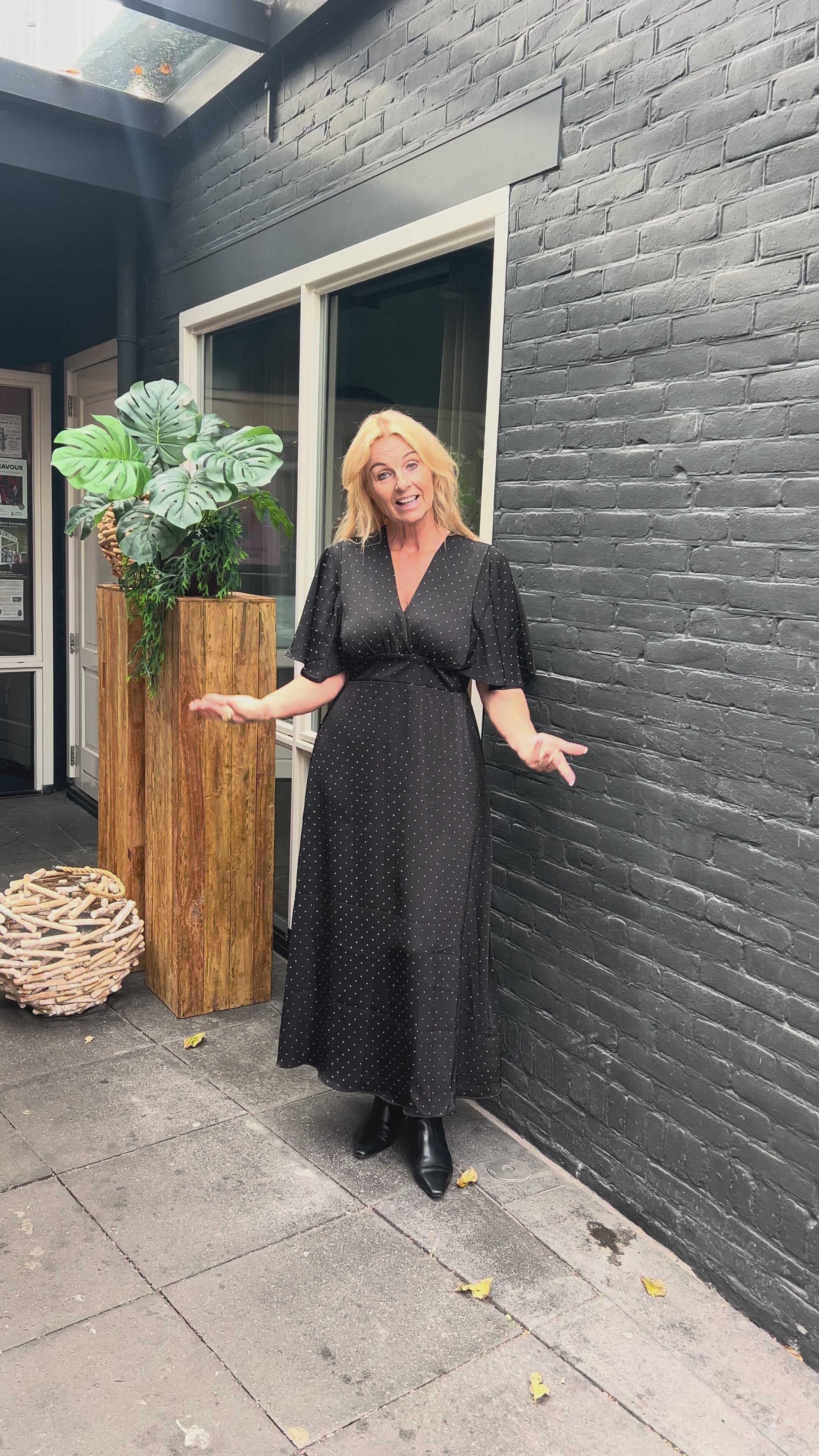 Deze elegante lange jurk geeft elke look een moderne, krachtige en toch vrouwelijke uitstraling. De zwarte stof is versierd met subtiele studs die de jurk een edgy touch geven, zonder zijn chique karakter te verliezen. De lange mouwen zorgen voor een stijlvolle, verfijnde look en de twee strikdetails aan de voorkant voegen een speels en elegant accent toe. Een veelzijdige jurk die zowel casual chic als feestelijk gedragen kan worden.